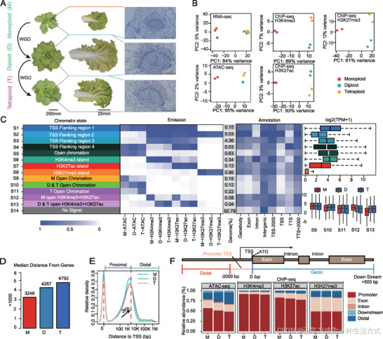 (D,E)单倍体(M)、二倍体(D)与同源四倍体(T)样本中,染色质开放区域(ACRs)到基因及转录起始位点(TSS)的中位距离。