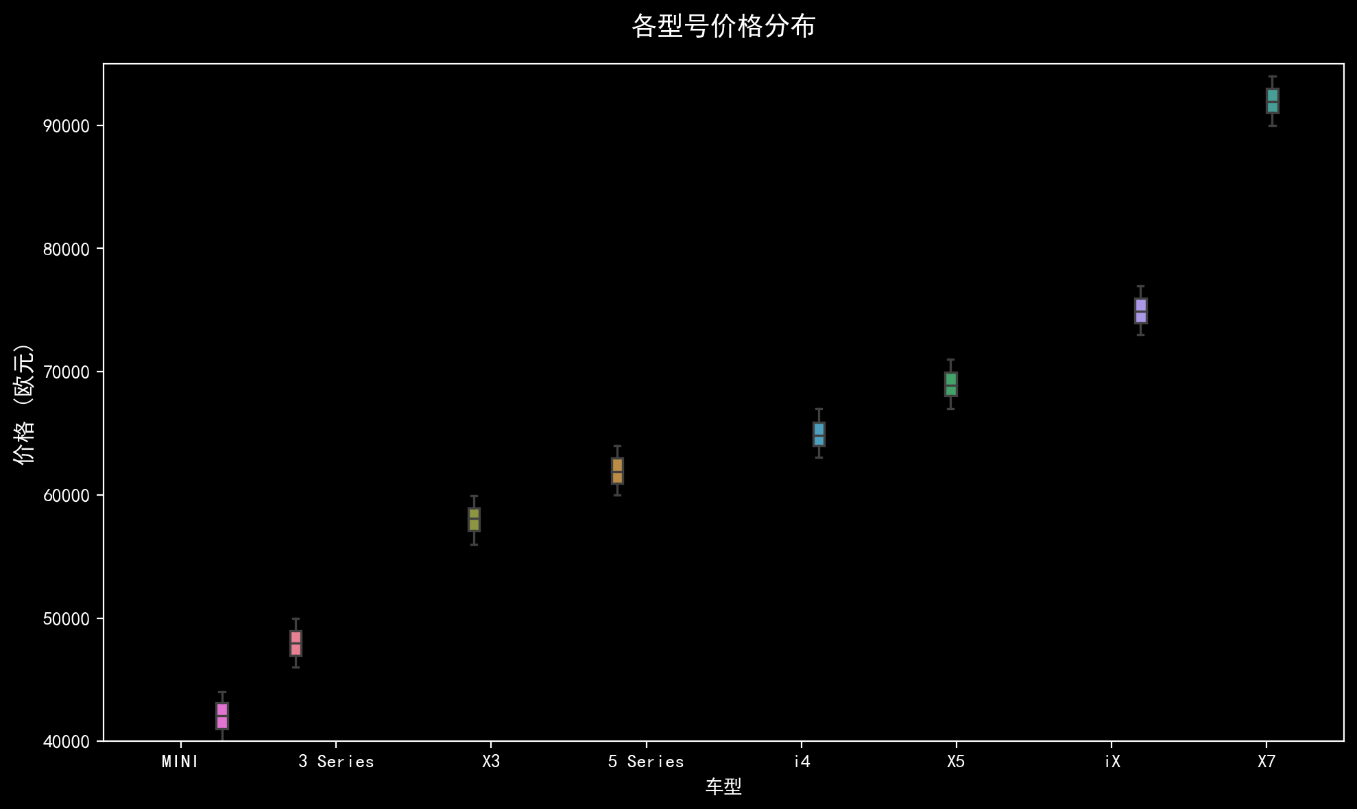 月度维度:全年月度均价仅波动约 260 欧元,无显著季节性特征,表明时间因素对宝马定价影响极小。