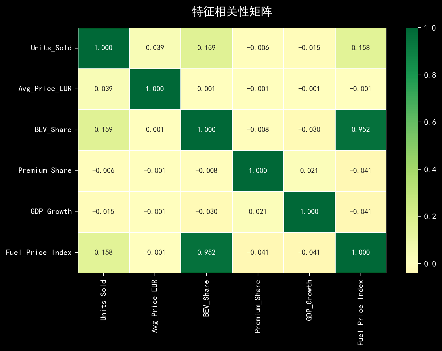 相关性维度:销量、GDP 增速、燃油价格指数等数值特征与价格相关性均极低(最大 r=0.039);BEV 占比与燃油价格指数相关系数高达 0.952,存在严重多重共线性,需在建模时剔除。