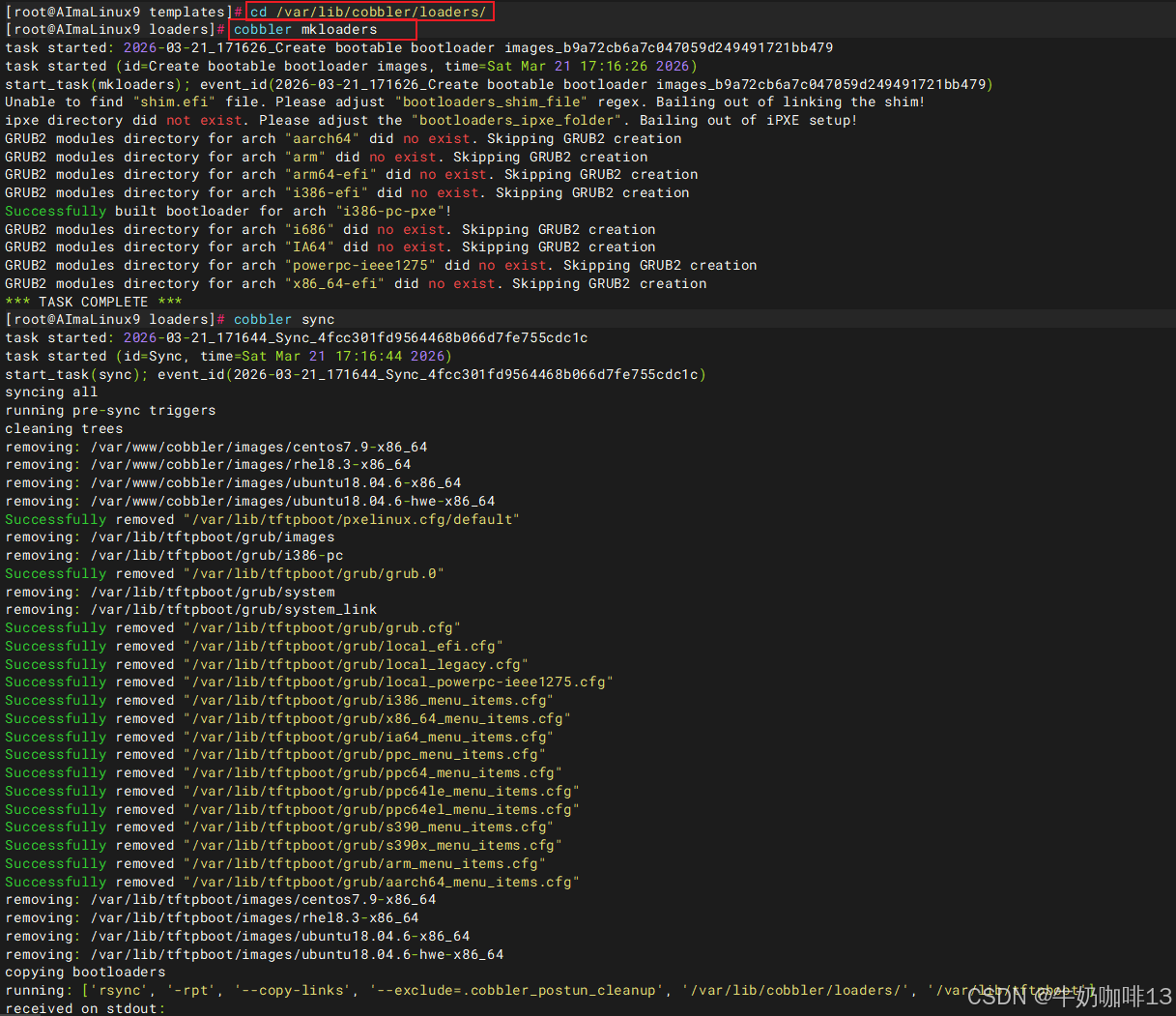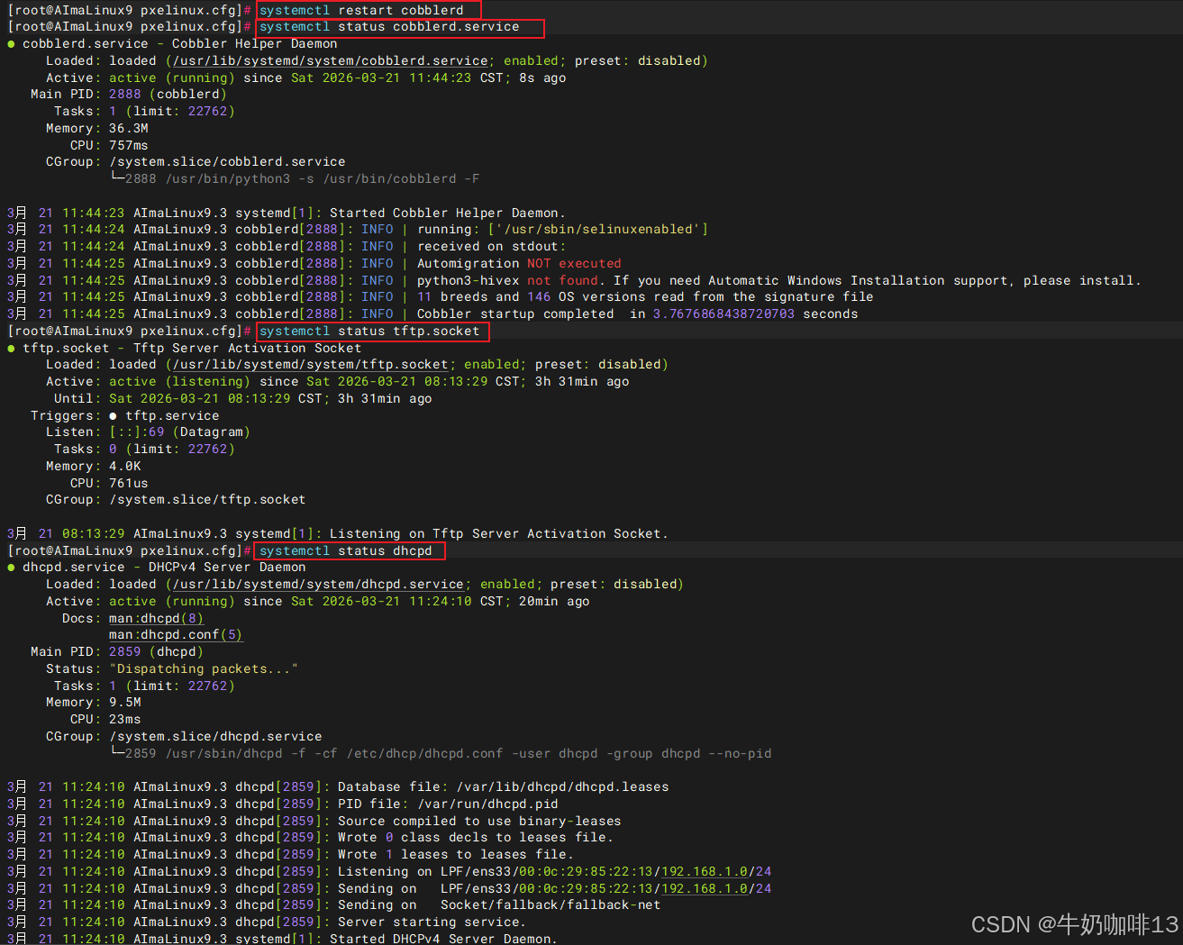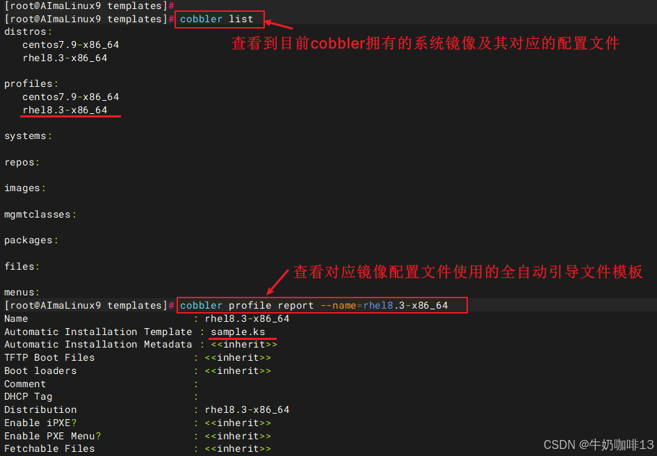2、所有红帽系(如:AlmaLinux、RockyLinux等)的系统在Cobbler中的自动化安装部署都与如下的操作步骤一致,需要注意的是在红帽系9及其更高版本的安装部署中对应的全自动安装模板ks文件修改两个参数(第一个参数是auth,需要改为authselect,第二个是install参数;需要注释掉即为#install,因为rhel9新版本下ks模板文件中,这两个过期参数已经被取消了)若不修改会导致安装出问题。