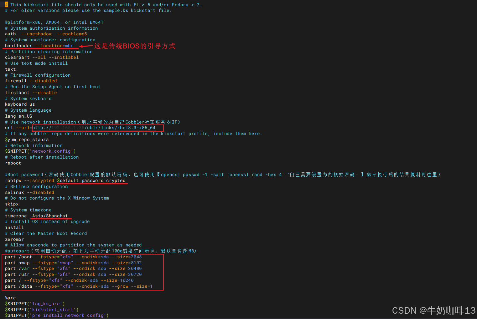 #接下来我们要做的,就是基于原始的ks模版文件,进行修改。修改完成后,修改profile中的Kickstart文件路径,使其指向我们自己的ks模版文件。)