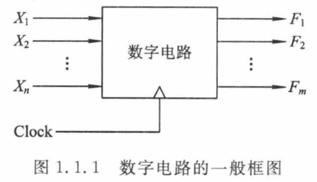 图 1.1.1 1.1.1 1.1.1 是数字电路的一般框图,它有 n n n 个输入 X 1 、 X 2 、 ⋯ 、 X n X_1、X_2、\cdots、X_n X1、X2、⋯、Xn 和 m m m 个输出 F 1 、 F 2 、 ⋯ 、 F m F_1、F_2、\cdots、F_m F1、F2、⋯、Fm,此外还有一个定时信号,即时钟脉冲信号(Clock)。每一个输入 X i X_i Xi 和输出 F j F_j Fj 都是时间和数值上离散的二值信号,用数字 0 0 0 和 1 1 1 来表示。在数字电路和系统中,可以用 0 0 0 和 1 1 1 组成的二进制数码表示数量的大小,也可以用它们来表示两种不同的逻辑状态。当用 0 0 0 和 1 1 1 来表示客观事物的两种对立状态时,它们表示的不是数值,而是逻辑 0 0 0 和逻辑 1 1 1,这两种对立的逻辑状态称为二值数字逻辑 或简称为数字逻辑 。数字电路的输出和输入之间满足一定的逻辑关系,因而数字电路也称为逻辑电路 。