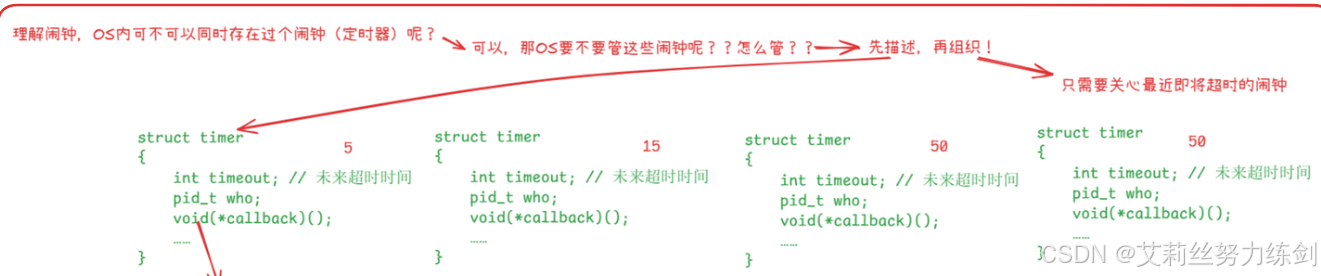 理解闹钟,看看操作系统内同时存在多种闹钟(定时器)?操作系统要不要管理?怎么管理?先描述,再组织。