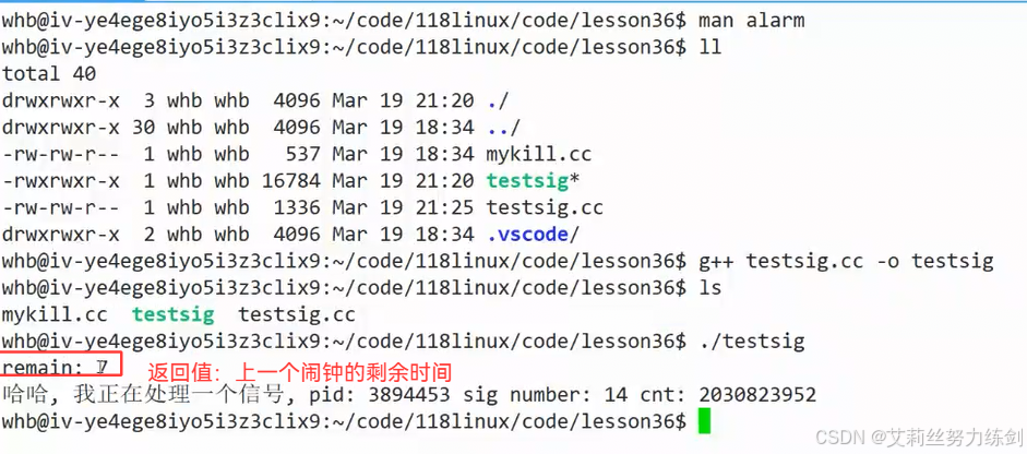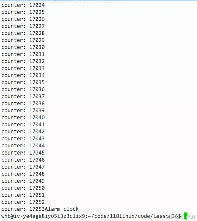 这就说明,alarm是一个一次性闹钟,而且这个闹钟只对这个进程只会有同一个闹钟(从头到尾调用alarm就一个闹钟)。