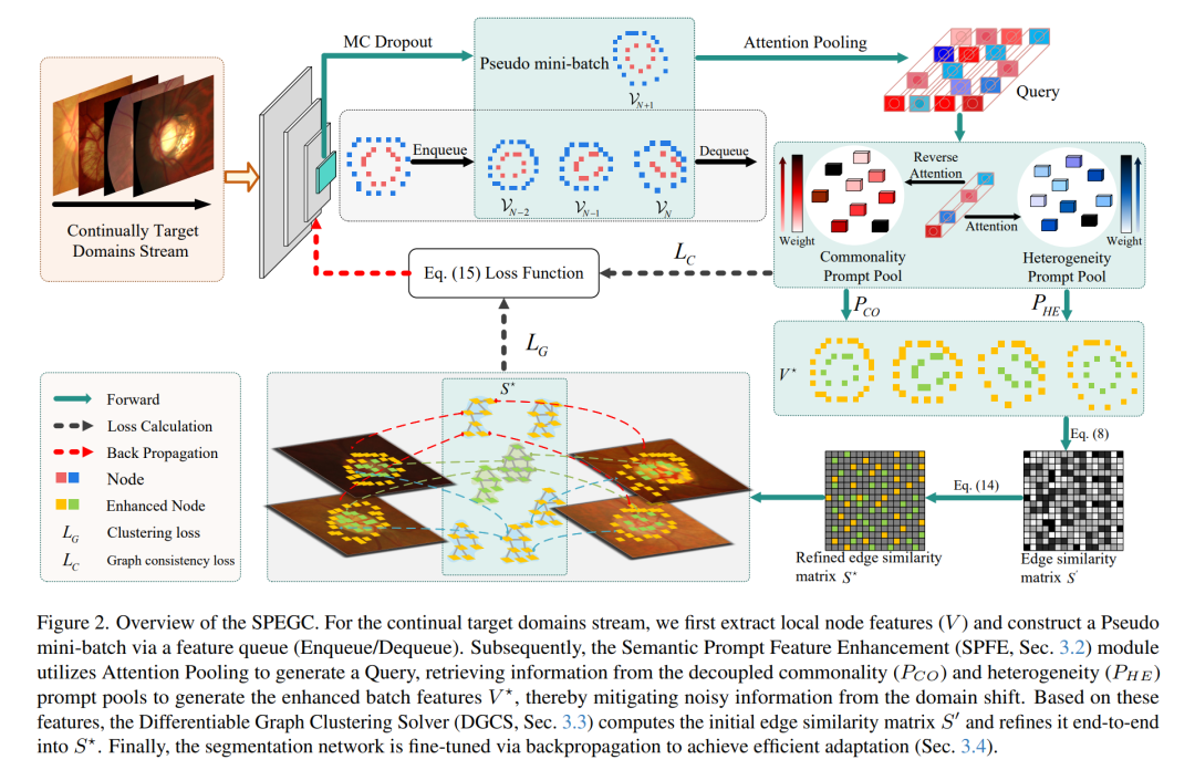 SPEGC通过语义提示增强特征鲁棒性、可微分图聚类挖掘数据结构信息,实现了医学图像分割模型在连续测试数据中的高效、稳定持续自适应,有效解决了域偏移下的错误累积和灾难性遗忘问题,为医疗AI的临床实际部署提供了新的有效方案。