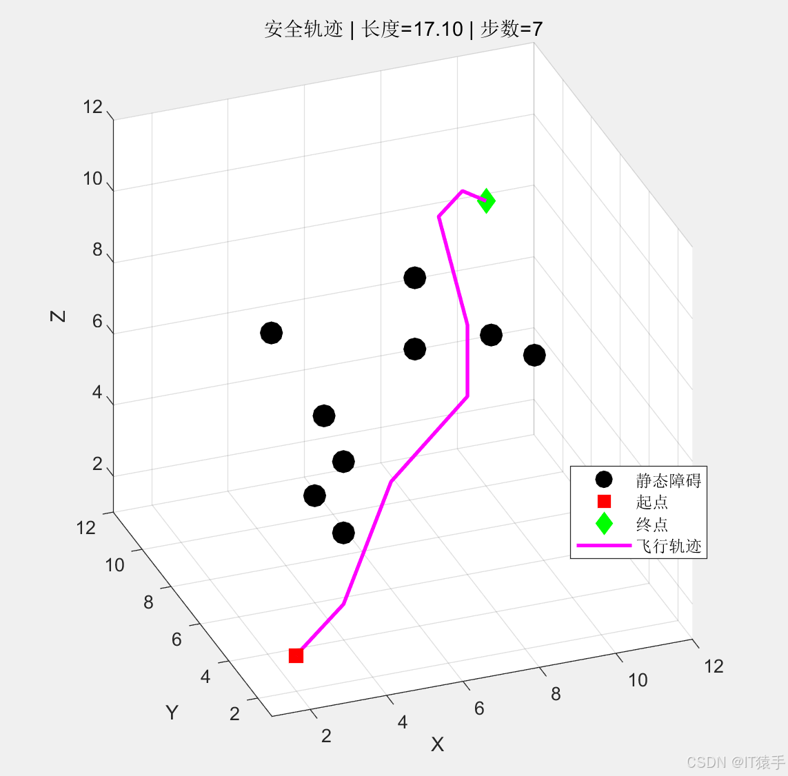 - 绘制三维静态最优轨迹图:展示无人机起点、终点、静态障碍物、最优路径的位置关系;