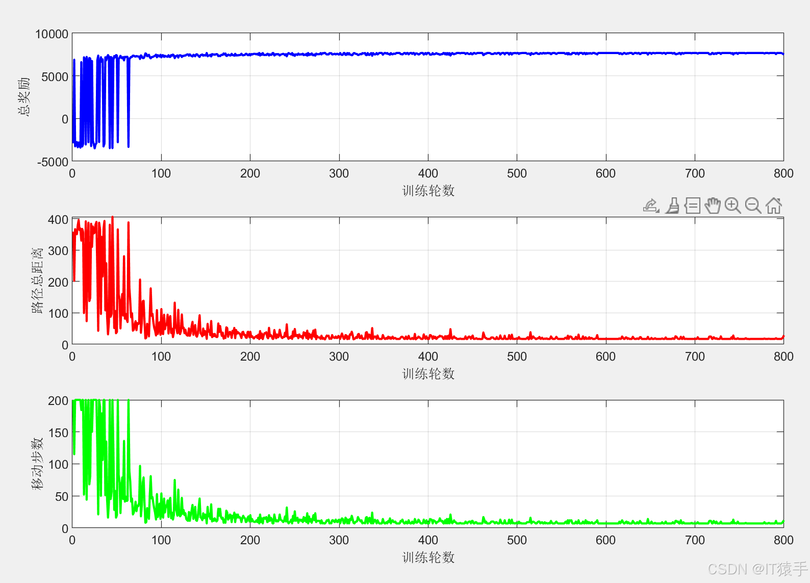 步骤5:可视化输出 - 绘制训练曲线:包括累计奖励曲线、路径长度曲线、移动步数曲线,用于分析算法的收敛性;