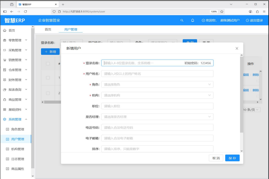 | UM-ADD-012 | 用户管理 | 新增用户 | 已登录系统,且具有新增用户权限 | 验证排序输入框格式 | 1. 点击新增按钮 2. 排序输入框,输入lqn123 3. 其他填写项正确,点击保存 | lqb123 | 系统提示:仅支持数字格式 | P2 |