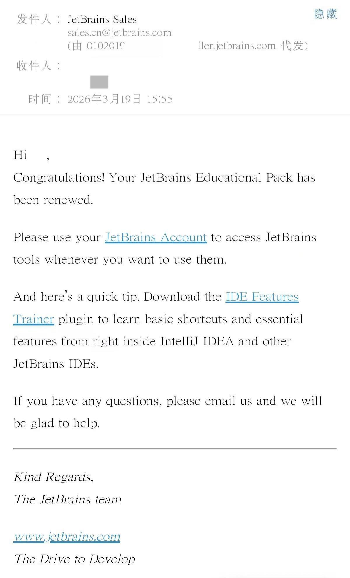 - 授权续期:教育授权有效期为 1 年,到期前 1 个月左右,JetBrains 会发送续期提醒邮件,凭有效的在校学生身份可再次申请续期,继续免费使用。