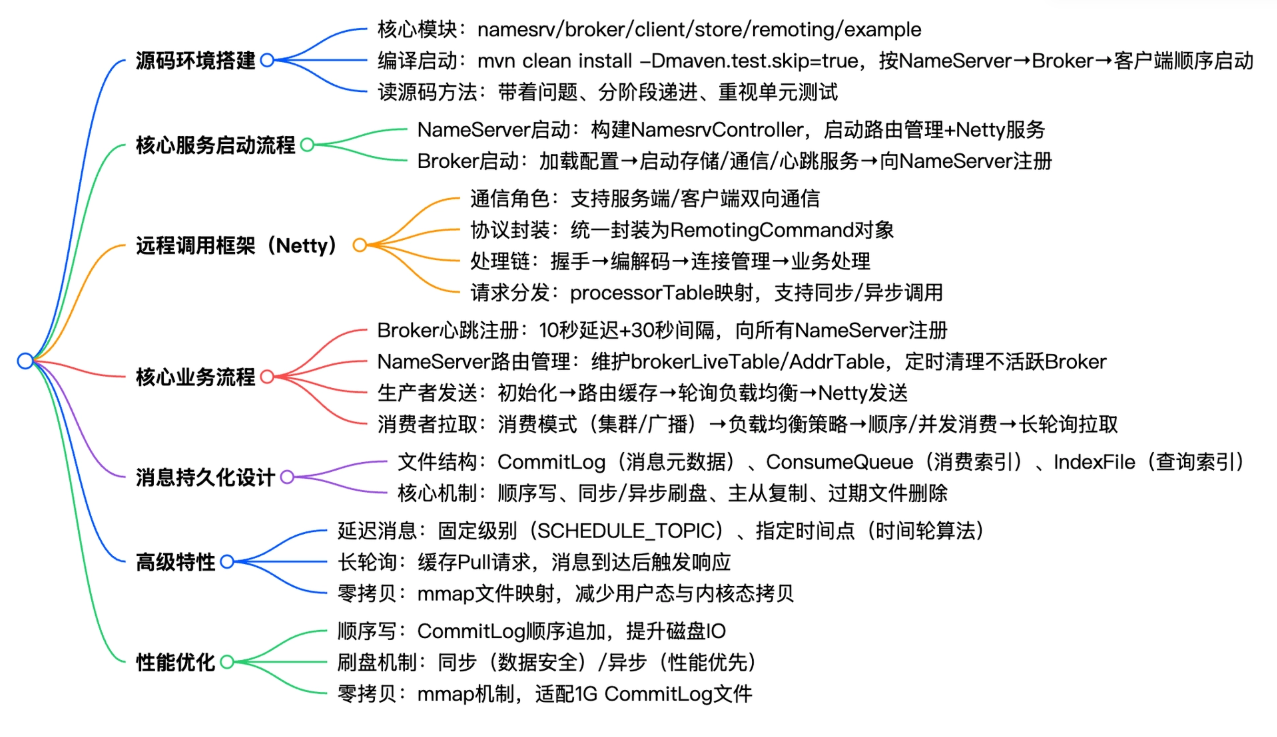 RocketMQ 的源码设计围绕"三高"目标展开,核心亮点包括: