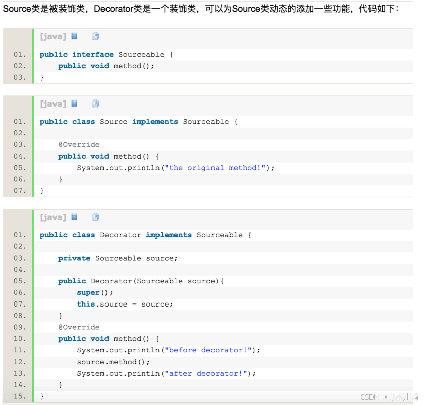 (给对象动态增加新功能,需持有对象实例):装饰模式就是给⼀个对象增加⼀些新的功能,⽽且是动态的,要求装饰对象和被装饰对象实现同⼀个接⼝,装饰对象持有被装饰对象的实例: