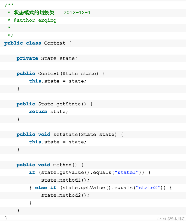 (对象状态改变时改变其⾏为):当对象的状态改变时,同时改变其⾏为。状态模式就两点:1、可以通过改变状态来获得不同的⾏为。2、你的好友能同时看到你的变化。