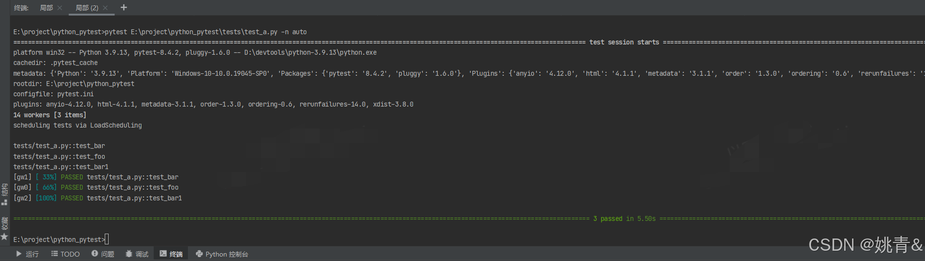 pythonfrom time import sleep def test_foo(): sleep(1) assert True def test_bar(): sleep(1) assert True def test_bar1(): sleep(1) assert True- 执行