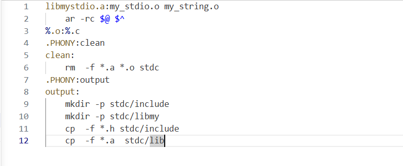 对应makefile是这样写的,但是我们还需要把库发布出来,所以tmakefile文件需要像下面一样写,其中stdc是我们在当前目录下的一个新的目录,所以我们想要clean的时候应该clean我们的stdc,因为它里面包括了我们所有的.a文件和.h文件