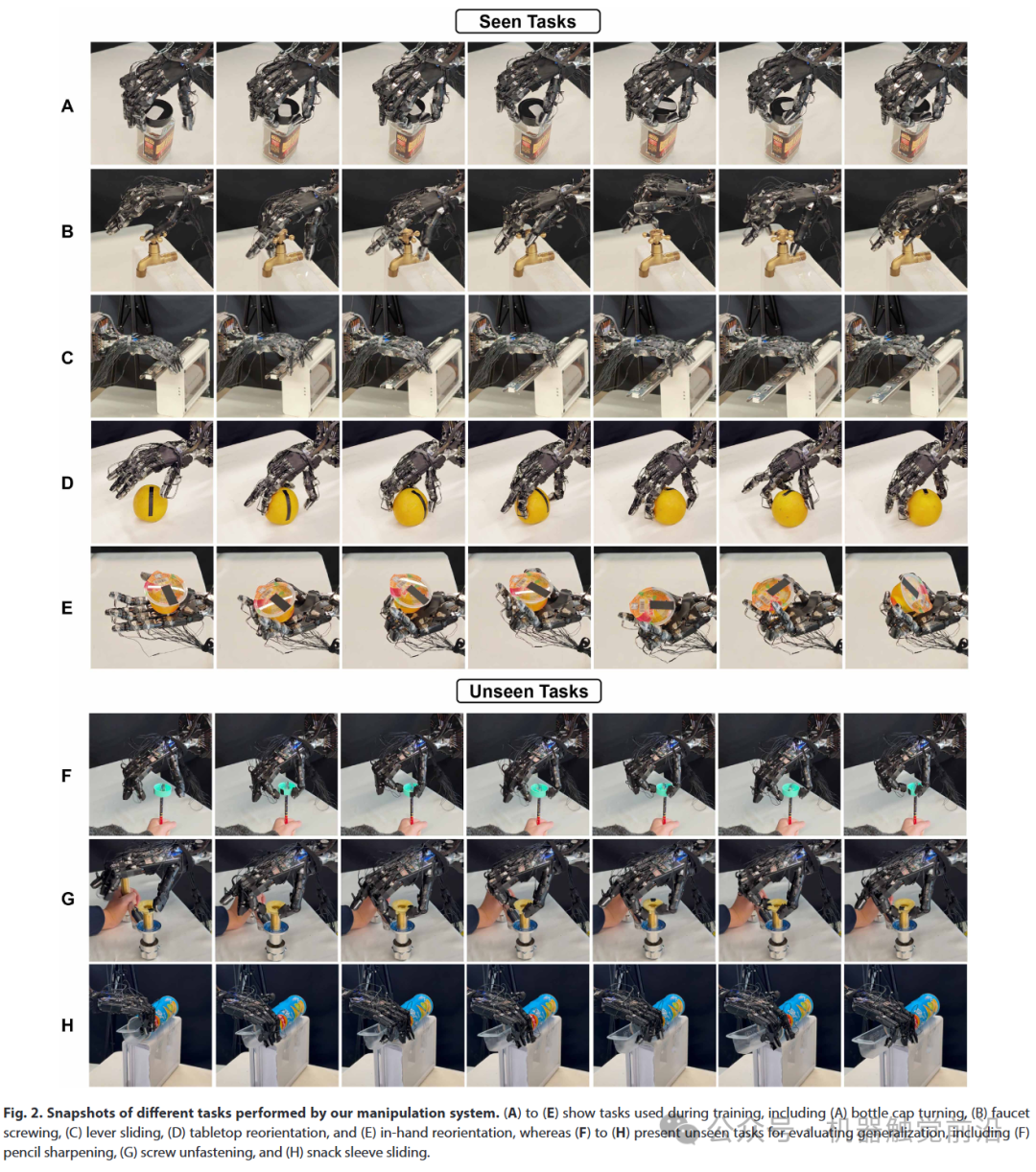 在真实的物理系统部署中,这套总传感成本仅约250美元的系统展现出了惊人的能力。实验采用了Shadow Hand灵巧手作为执行机构,在转瓶盖、拧水龙头、滑动拨杆、桌面物体姿态调整和手内物体旋转这五项训练任务中,对25种不同的物体(包括3D打印的训练物体副本和形状材质各异的日常用品)进行了广泛测试。