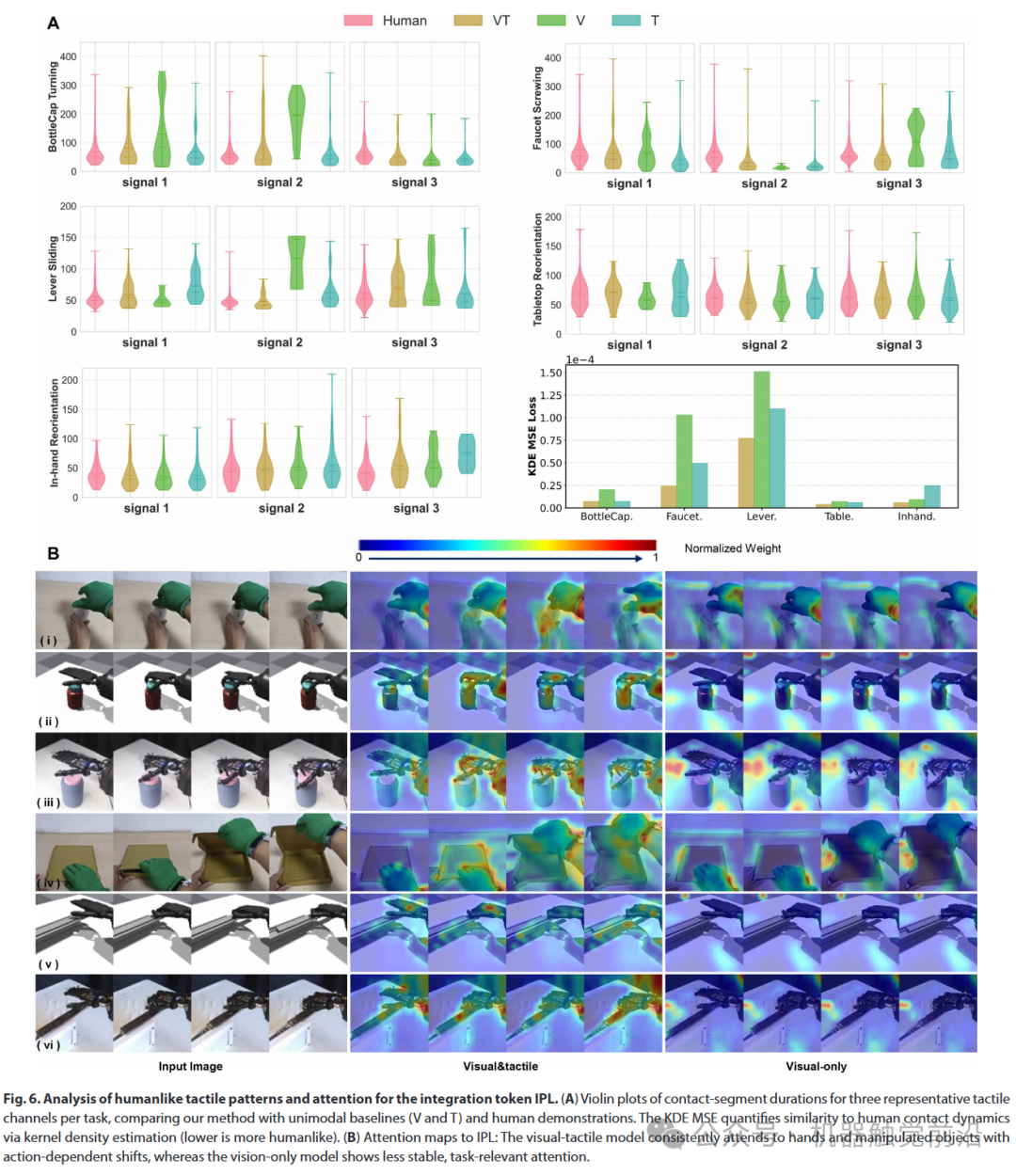 研究人员还深入分析了机器人的操作行为,发现引入视觉-触觉预训练后,机器人的接触模式(Contact Patterns)在时序结构上与人类演示惊人地相似。图6展示的注意力图(Attention Map)分析进一步揭示了其中的奥秘:纯视觉模型的注意力往往发散且不稳定,容易被背景干扰;而视觉-触觉模型的注意力则始终聚焦在手部和物体的交互区域。更有趣的是,这种注意力会随着操作过程动态变化------当手指接触物体时,注意力权重会瞬间集中在接触点和物体边缘;当物体形态发生改变(如盒子被打开)时,注意力也会随之转移到新的关键区域。这种"知道看哪里"的能力,并非来自人工标注,而是网络在预训练中为了恢复被遮挡的触觉信号而自发习得的。这与人类在操作物体时,通过触觉反馈来引导视觉注意力的认知机制不谋而合,标志着机器人开始具备了初级的"意图理解"能力。
