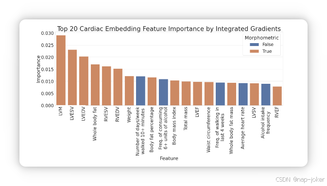 为了探索为什么以多模态的方式训练会改进单模态编码器,我们分析了表格特征对改进嵌入的贡献。表格数据的一个独特之处在于它的每个输入节点都对应一个单一的特征。我们将特征分为两类,形态特征和非形态特征。形态特征与尺寸和形状有关,并且在图像中具有直接的相关性,例如心室的体积,重量或汽车长度。使用集成梯度,我们计算了每个特征在测试样本中的重要性。为了生成心脏嵌入,最重要的7个特征都是形态特征,尽管它们只代表了所有特征的五分之一。 此外,所有24个形态学特征都位于重要性排名的前半部分。这些结果见图3和补充材料。我们假设模型专注于形态学表格特征,因为这些特征在图像中具有直接的相关性。在两种模态中提取这些特征增加了投影嵌入相似性,并最小化了对比损失,如补充材料所示。