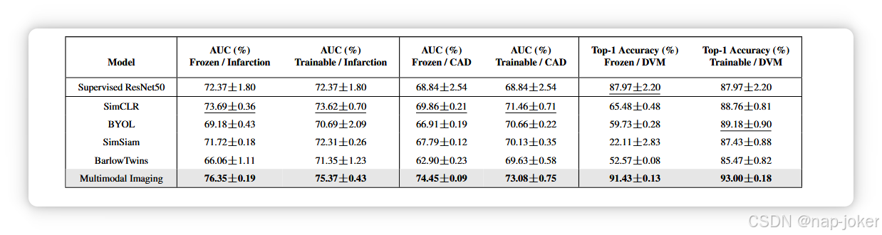 所有的成像编码器都是Res Net50s [ 26 ],生成大小为2048的嵌入。我们的多模态模型使用了一个表格式编码器,它是一个多层感知器( MLP ),具有一个大小为2048的隐藏层,可以生成大小为2048的嵌入。所有的权重都是随机初始化的。我们的成像投影仪是一个隐藏层大小为2048的MLP,我们的表格投影仪直接从具有全连接层的嵌入中生成投影。投影大小为128 [ 13 ]。经过预训练后,去掉投影头并添加一个与输出类节点的全连接层。 为了评估模型的有效性,我们将其与全监督的ResNet50网络以及Sim CLR [ 13 ]、BYOL [ 22 ]、Sim Siam [ 17 ]、Barlow Twins [ 70 ]等多个对比解进行比较。我们使用冻结网络的线性探测来评估学习到的表示[ 13、15、33]的质量。我们还对每个网络进行了基准测试,同时在微调过程中保留了所有可训练的权重,因为这通常会在冻结的对应网络上得到改善,并将在实际中使用。对于心脏分类任务,我们使用受试者工作特征曲线下面积( area under the receiver operating characteristic curve,AUC )作为我们的度量,因为数据集对于我们的目标是严重不平衡的。在只有3 - 6 %的正类标签的情况下,一个总是预测负类的模型可以达到94 - 97 %的准确率。 对于DVM汽车数据集,由于有280 +个类别,我们报告了top - 1的准确率。结果报告为在微调过程中对5种不同的种子设置计算的平均值和标准差。两种心脏任务均从单个预训练模型中进行评估。完整的实验细节,包括基线模型的设置,可在补充材料中找到。