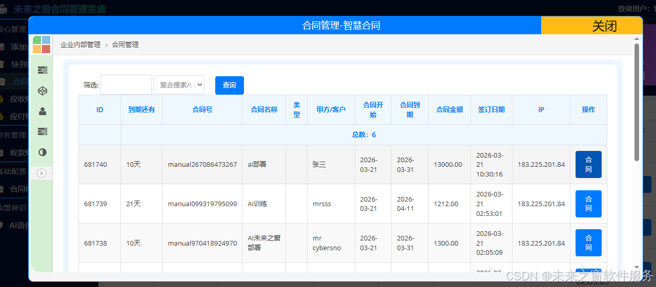 合同管理模块实现合同全生命周期集中管控,涵盖合同录入、查询、编辑、归档、状态变更等功能。支持按合同号、客户、日期、类型多维度筛选检索,记录合同执行过程与变更历史。确保合同信息可追溯、可查阅、可管控,形成标准化管理流程,提升合同数据安全性与业务透明度。