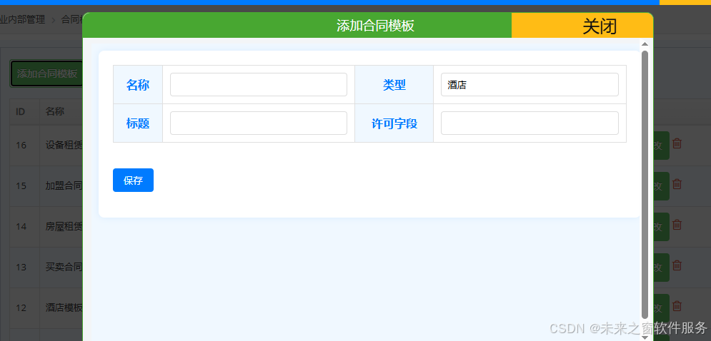 合同类型模块用于对系统内合同进行标准化分类管理,支持自定义新增、编辑、删除类型项。可根据业务场景设置销售合同、服务合同、采购合同等类别,统一归类规则。通过规范类型体系,便于后续合同查询、统计分析与权限区分,提升数据管理规范性,为业务统计与报表生成提供基础分类支撑