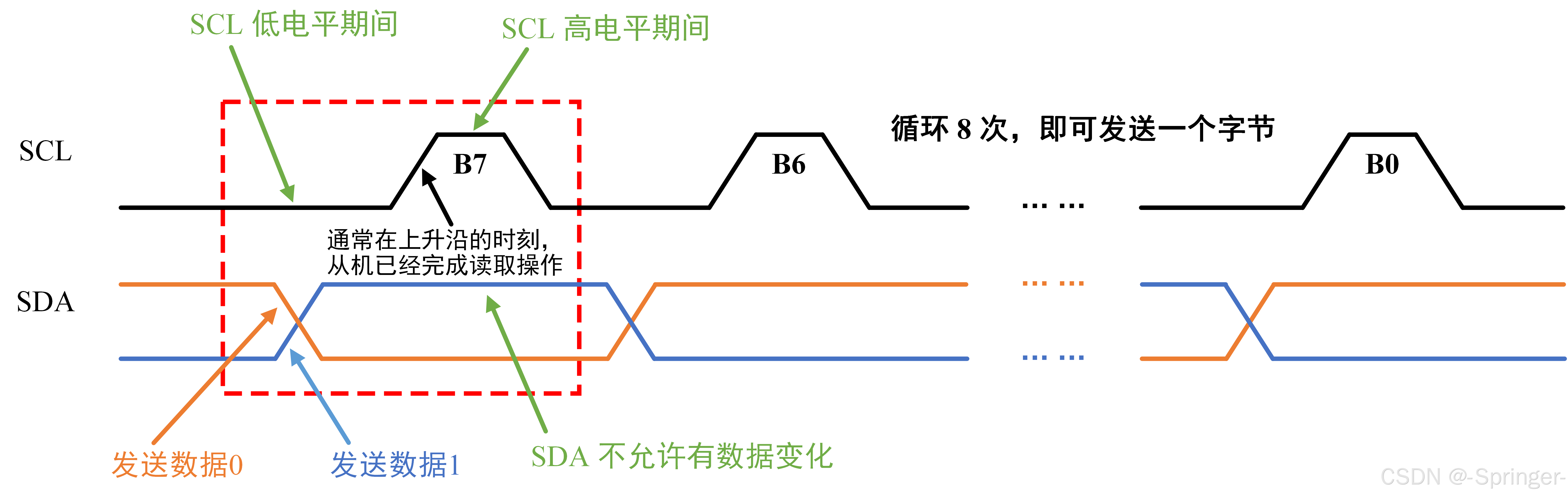 SCL 低电平期间,主机 将数据位依次放到 SDA 线上(高位先行),然后释放 SCL,从机将在 SCL 高电平期间读取数据位,所以 SCL 高电平期间 SDA 不允许有数据变化,依次循环上述过程 8 次,即可发送一个字节。