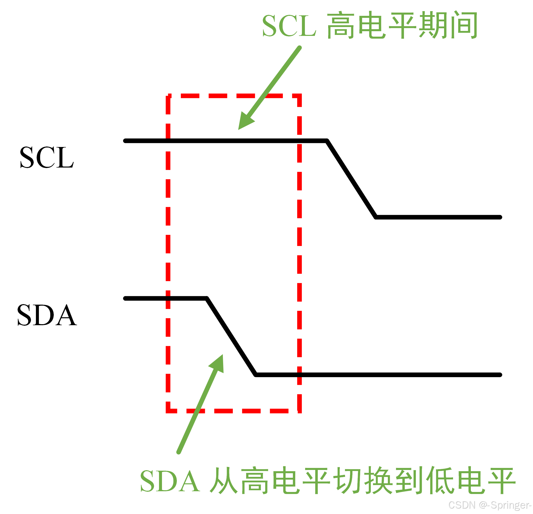 SCL 高电平期间,SDA 从高电平 切换到低电平。