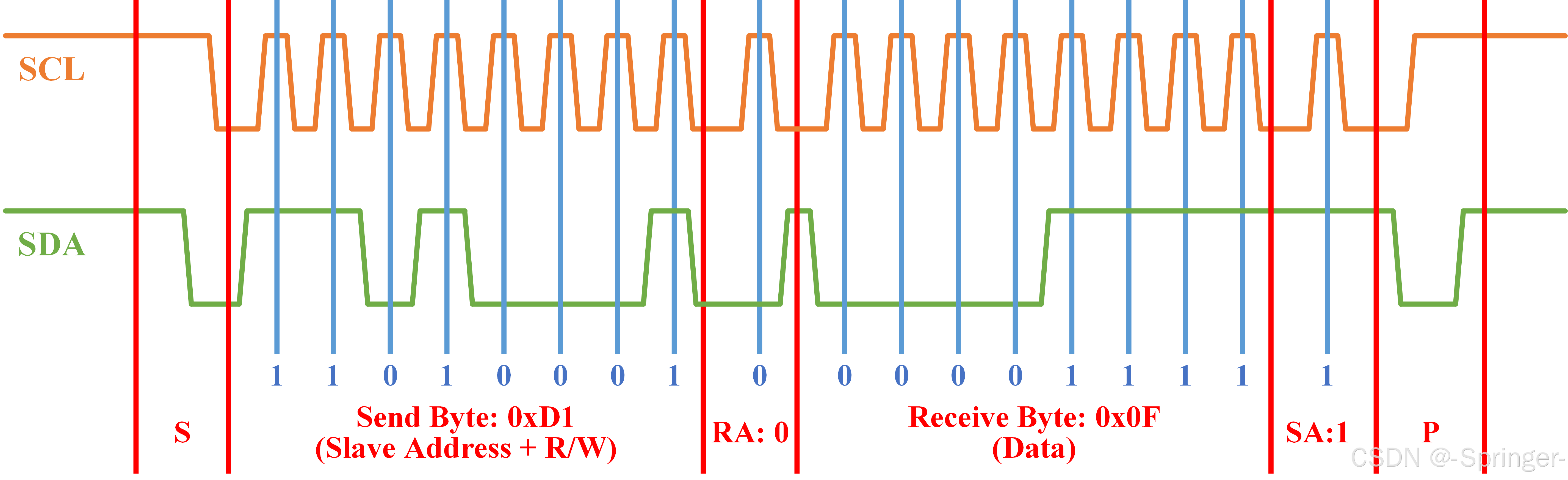 SCL 低电平期间,从机 将数据位依次放到 SDA 线上(高位先行),然后释放 SCL,主机将在 SCL 高电平期间读取数据位,所以 SCL 高电平期间 SDA 不允许有数据变化,依次循环上述过程 8 次,即可接收一个字节(主机在接收之前,需要释放 SDA)。