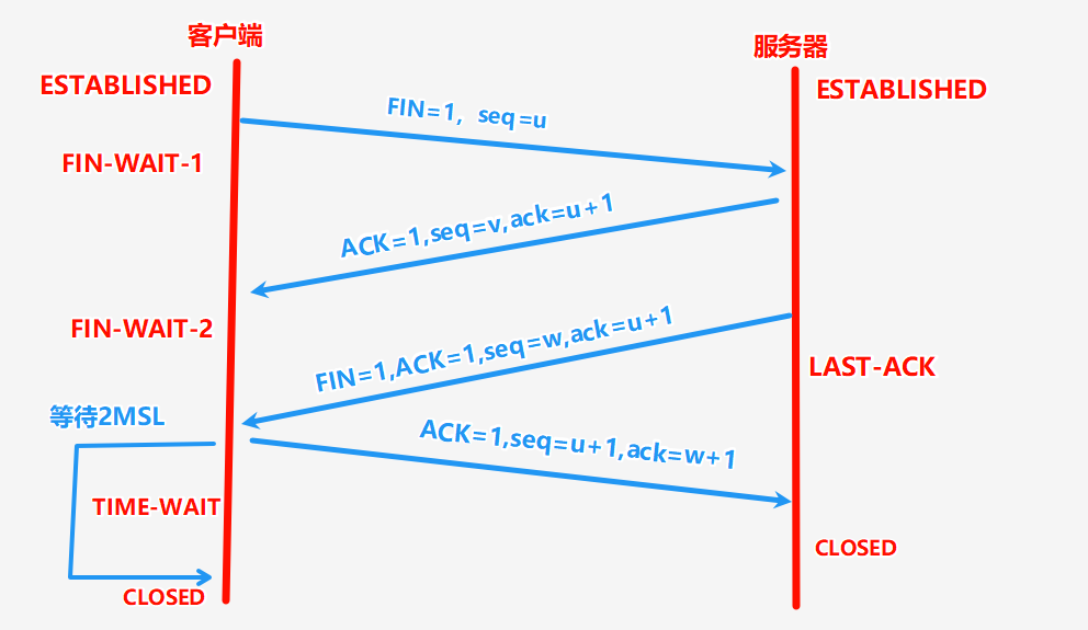- 第一步:客户端 → 服务器(FIN=1,seq=u)