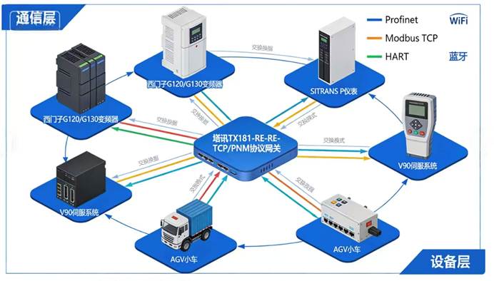 其核心作用是打通跨协议设备壁垒,实现数据统一交互:西门子G120/G130变频器、V90伺服采用Profinet/IRT协议,SITRANS P仪表支持HART协议,AGV依托WiFi、蓝牙通讯,经网关并行转换后,各类设备可在统一平台协同作业。网关支持Profinet、Modbus TCP、HART等多协议转换,可实时路由数据、完成格式适配,满足现场监控与上位调度需求。