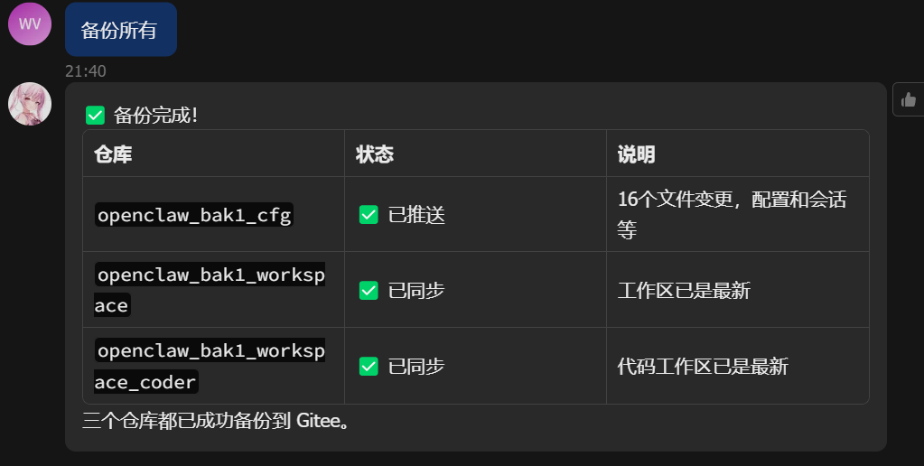 首次备份输入:/openclaw-gitbak备份所有(openclaw会记住你的备份手段)