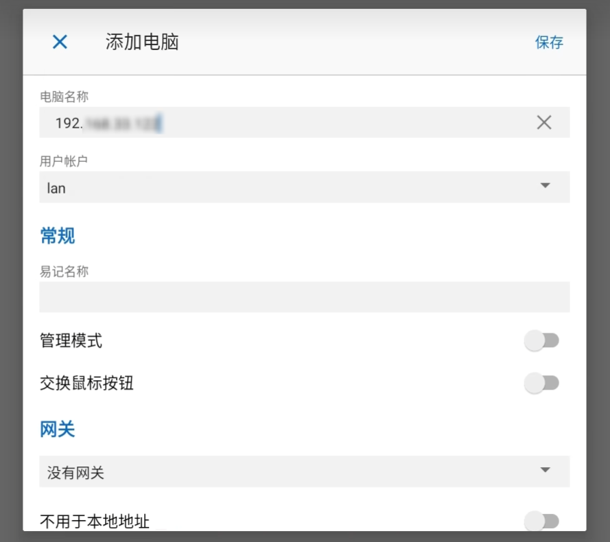 2. 在"电脑名称 "栏输入被控电脑的IP地址 ,在"用户账户"添加管理员账户及密码 ,其他配置可根据需要自行调整或保持默认,点击**"保存"**。