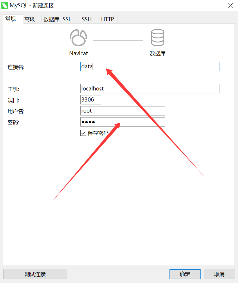 - 填写连接名,密码是mysql数据库主机的密码,不是你这里的密码: