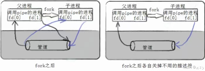 当父进程fork子进程后,子进程将复制父进程的文件描述符表,父子进程都拥有相同的fd[0]、fd[1],都指向同一个管道对象,要实现父子进程间的管道通信,需要父子进程各自关闭不需要的文件描述符,如实现父读子写,则父进程关闭fd[1]写端,子进程关闭fd[0]读端,每个进程只保留各自需要的一端,从而实现父子进程间的管道通信。