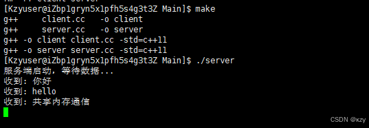 通过Makefile就可实现客户端和服务端的一键化编译,生成可执行文件client、server,须先启动服务端再启动客户端,服务端负责创建共享内存并进入等待状态,客户端启动后获取共享内存并开始写入数据,服务端读取并打印数据,从而完成二者的通信,结果如下所示: