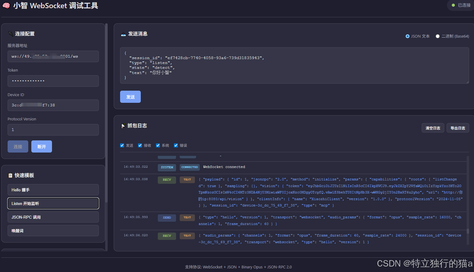 为了解决上述痛点,我们开发了小智 WebSocket 调试工具,提供一个完整的协议交互可视化平台。