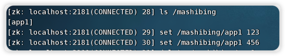 [zk: 192.168.58.200:2181,192.168.58.200:2182,192.168.58.200:2183(CONNECTED) 2] set /mashibing/test 12345