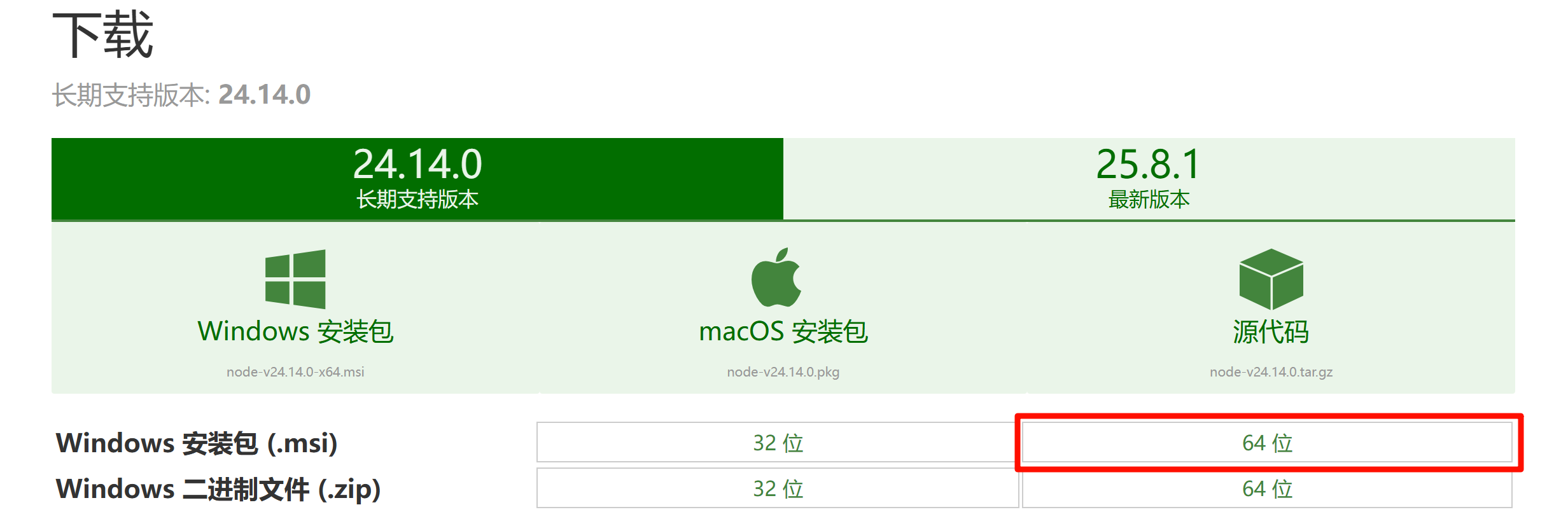 3.LTS表示稳定支持版,我们可以选择安装24的nodejs