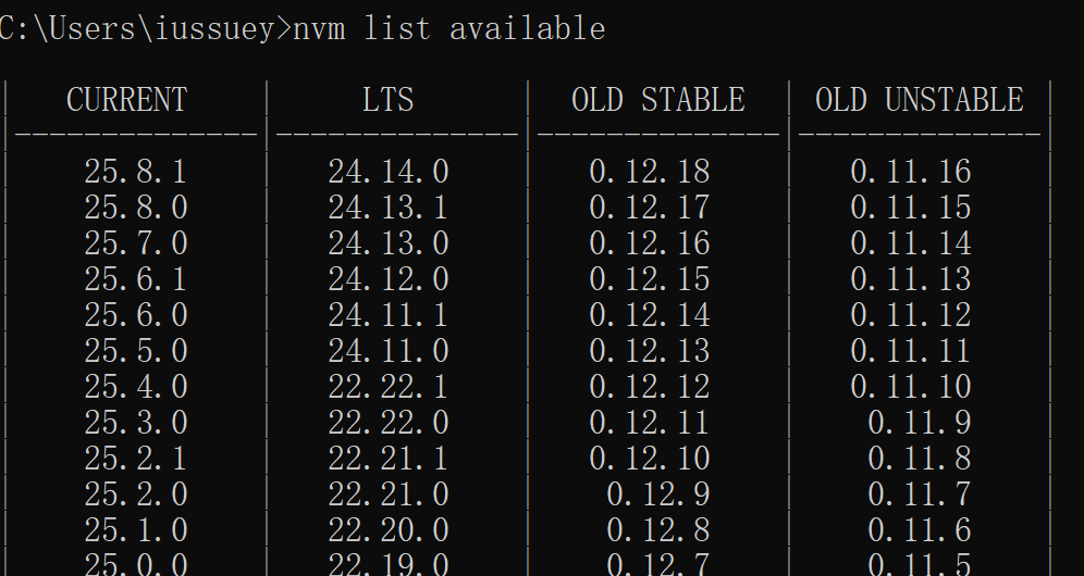 # 查看可安装的 Node.js 版本