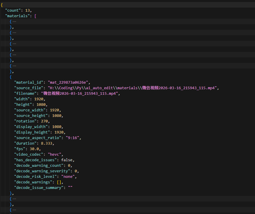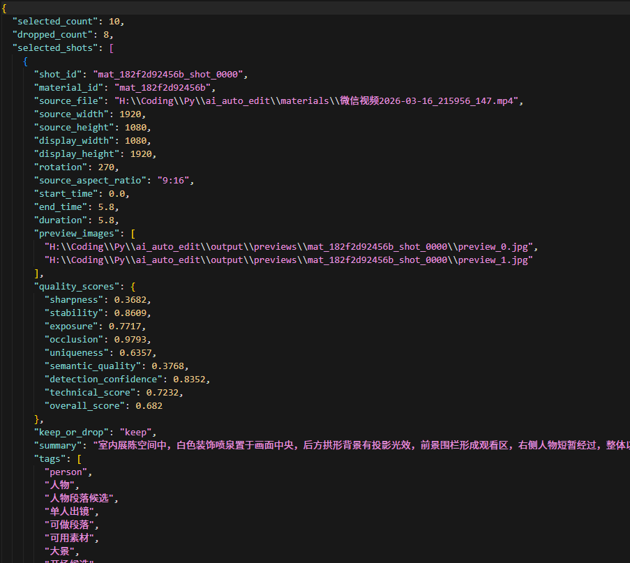 先把原始视频素材统一导入,然后自动切镜头,给每个镜头打分,生成镜头级 JSON 数据。