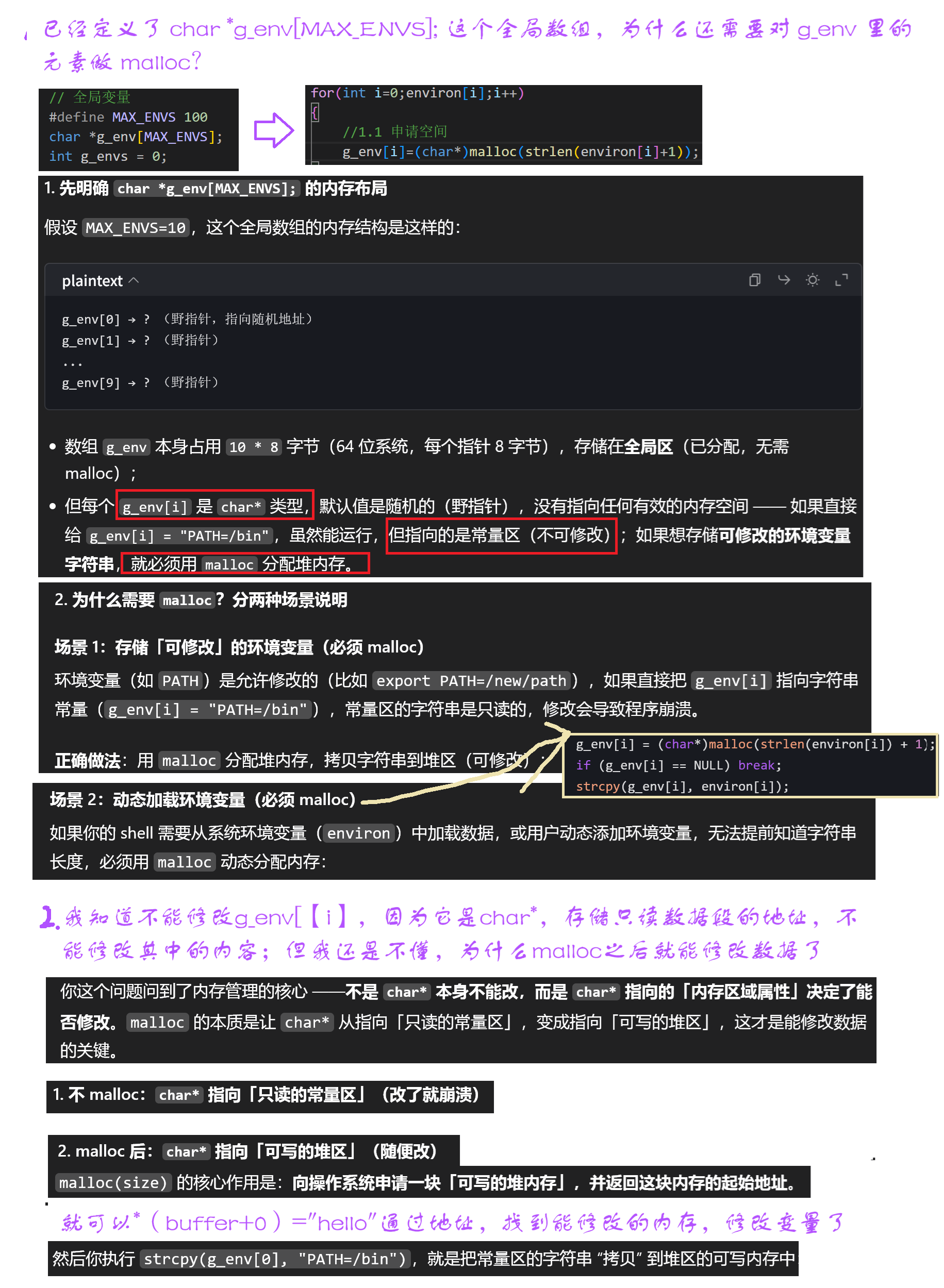 已经定义了 char *g_env[MAX_ENVS]; 这个全局数组,为什么还需要对 g_env 里的元素做 malloc?