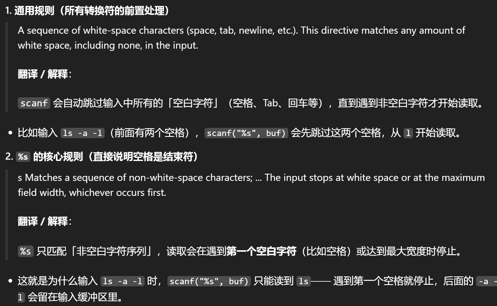换行符\n也会被写入到自定义的s缓冲区中,比如得到 ls -a -l\n,进而得到 ls -a -l\n\0 需要后续手动删除\n