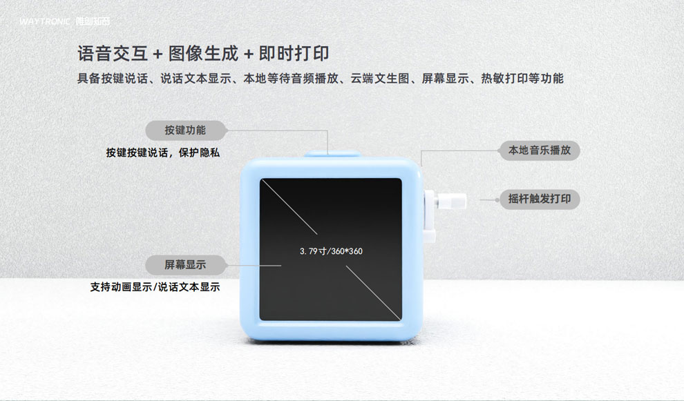 屏显能力:最大支持360×360分辨率动画/图片显示,适合儿童贴纸机的预览与互动;