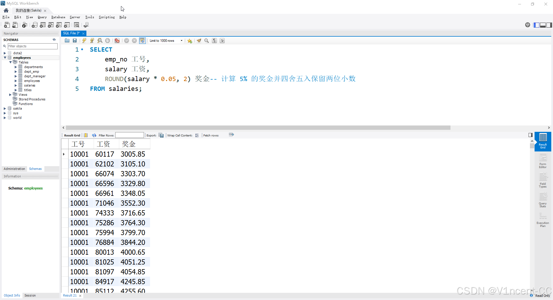 ROUND(salary * 0.05, 2) 奖金-- 计算 5% 的奖金并四舍五入保留两位小数