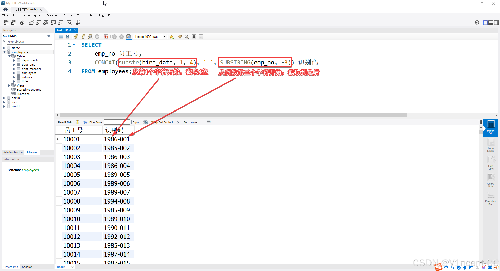 CONCAT(substr(hire_date, 1), '-', SUBSTRING(emp_no, -3)) 识别码