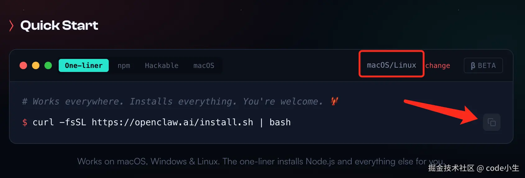 打开 Openclaw 官网:<openclaw.ai/ ,下滑找到下图位置
