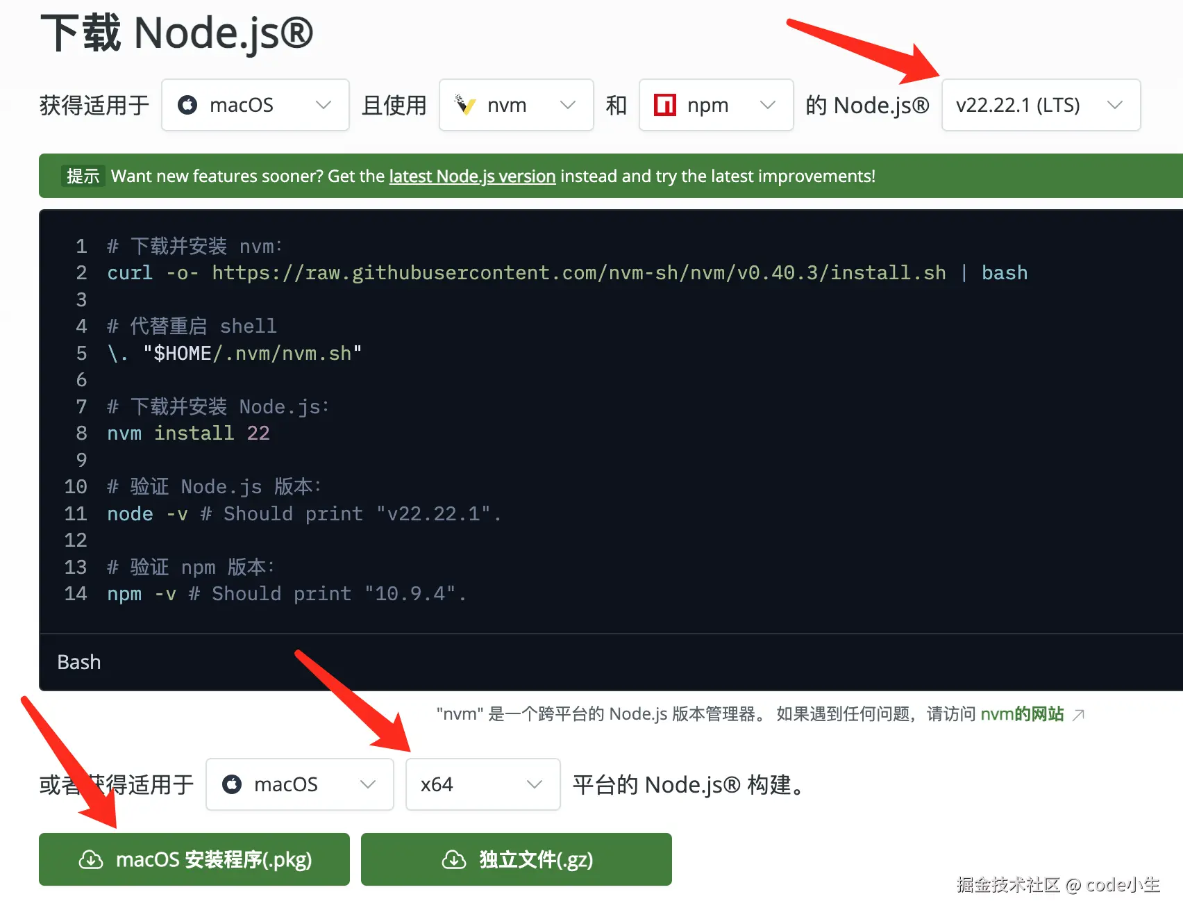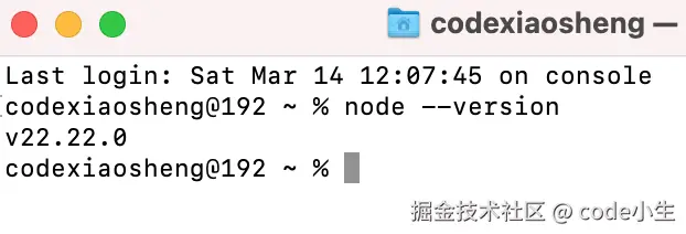 Node.js 的版本一定要大于 22,但也别太新,小生刚开始安装了最新的 24.x,结果提示不可用。