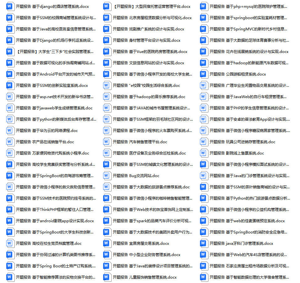 以上是某同学的毕业设计答辩的过程,如果你现在还没有参加答辩,还是开题阶段,已经选好了题目不知道怎么写开题报告,可以下面找找有没有自己符合自己题目的开题报告内容,列表中的开题报告都是往届真实的开题报告,可发送使用或参考。文末或底部来联xi可免费获取
