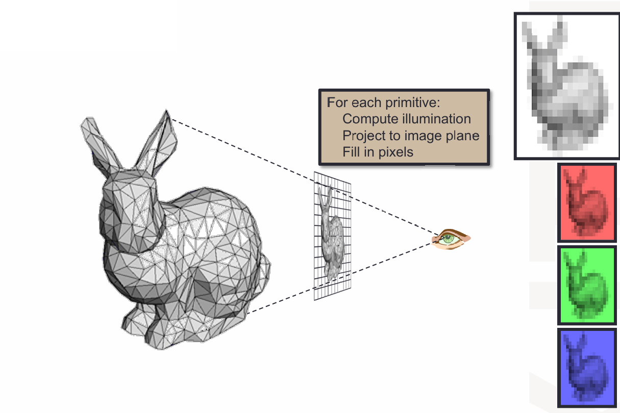 Rasterization(光栅化) 把三维场景投影到二维图像平面,然后决定每个像素的颜色。