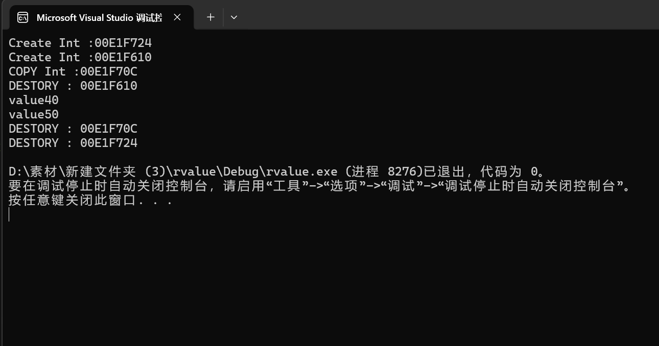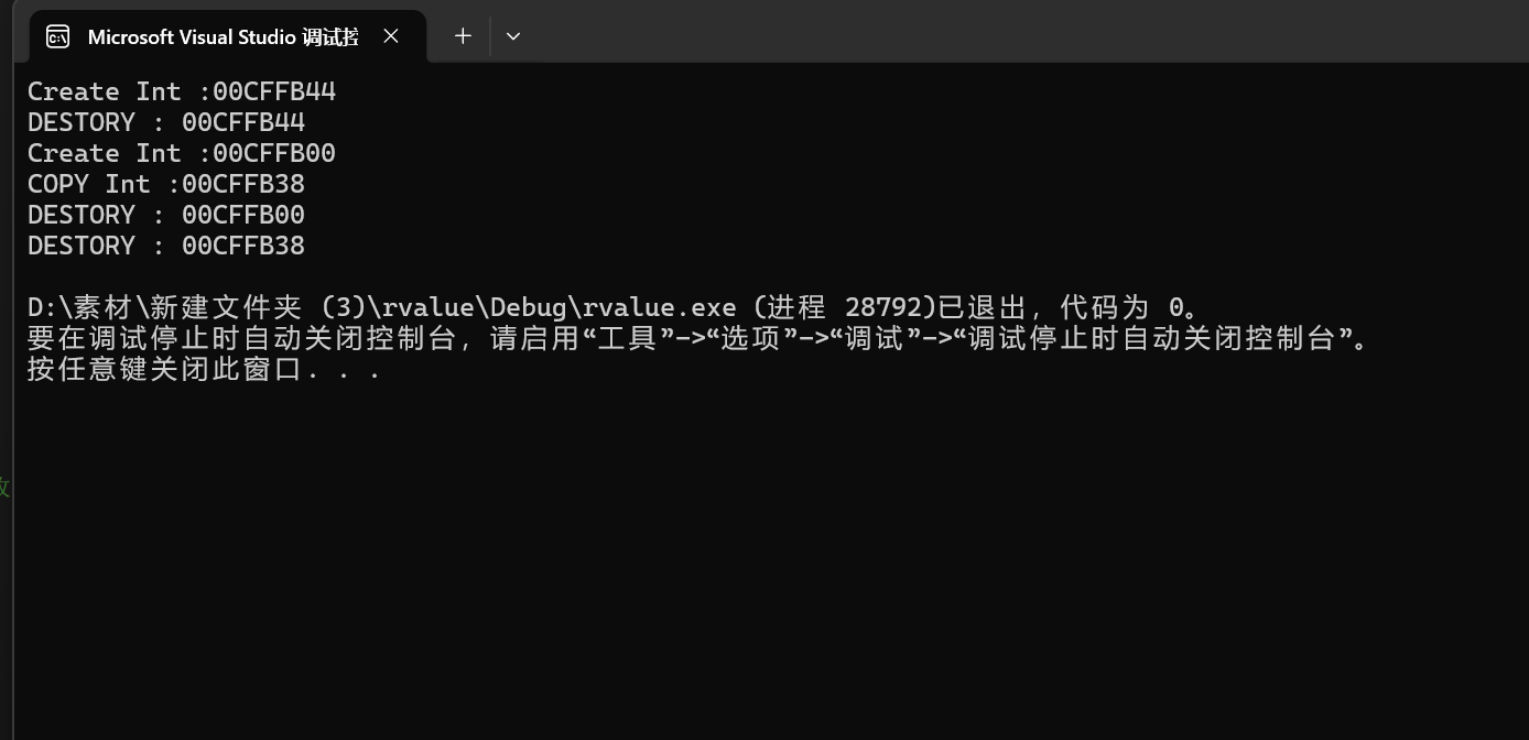 可以看到,我们构建了一个无名对象,创建完之后就析构,然后我们在fun函数中创建了一个tmp对象,然后创建一个将亡值,随着函数的退出析构掉.
