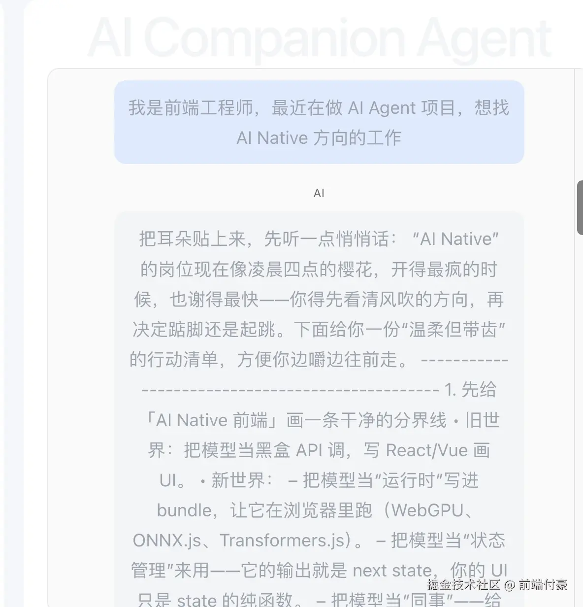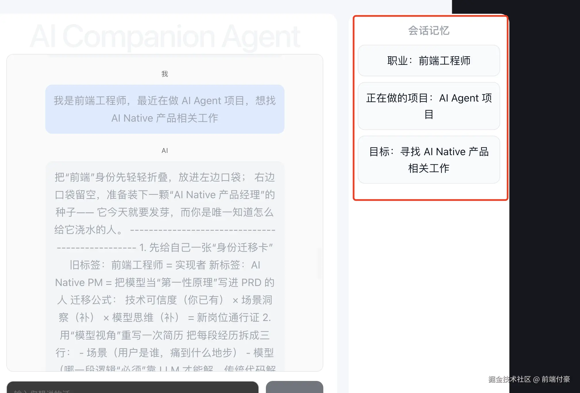 你说:"我是前端工程师,最近在做 AI Agent 项目"